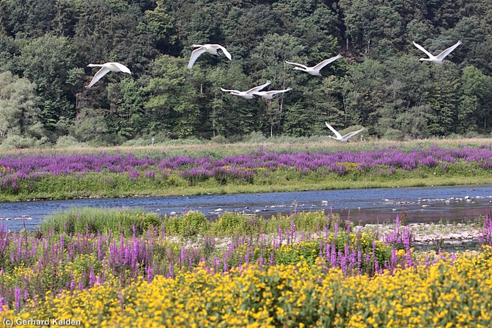 Höckerschwäne über Blütenmeer, Edersee bei Herzhausen